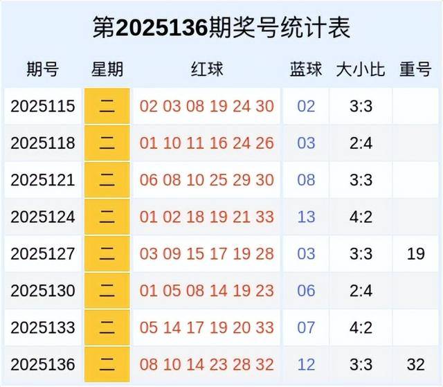 重号分析:上周二开出重号为32,在近8期同周二的奖号数据中,开出重号的概率为25.00%,本周二预测会开出重号:10,23,27。