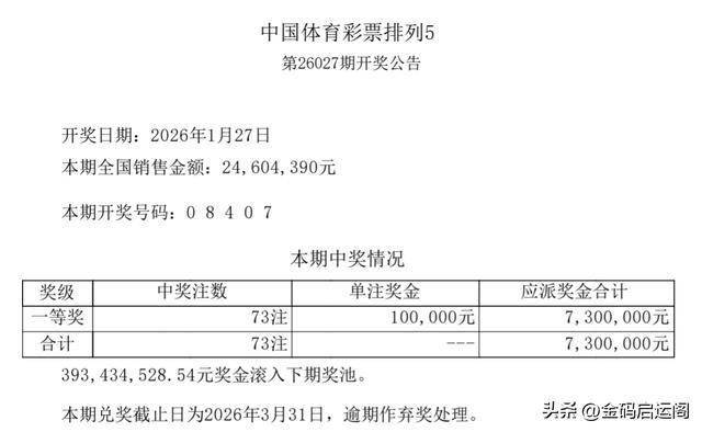 六合彩,六合彩开奖结果,六合彩预测,六合彩走势图,六合彩投注,六合彩技巧,六合彩结果今期,六合彩玩法排列五第26027期开奖号码揭晓:0、8、4、0、7。本期全国共开出 73注一等奖,单注奖金十万元。奖池资金保持在 3.93亿元。