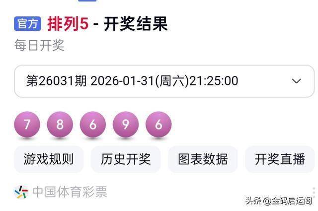 六合彩,六合彩开奖结果,六合彩预测,六合彩走势图,六合彩投注,六合彩技巧,六合彩结果今期,六合彩玩法排列5第26031期开奖。本期开奖号码为:7、8、6、9、6。这组独特的号码一经开出,便因其巧妙的结构引发了彩民的热议。