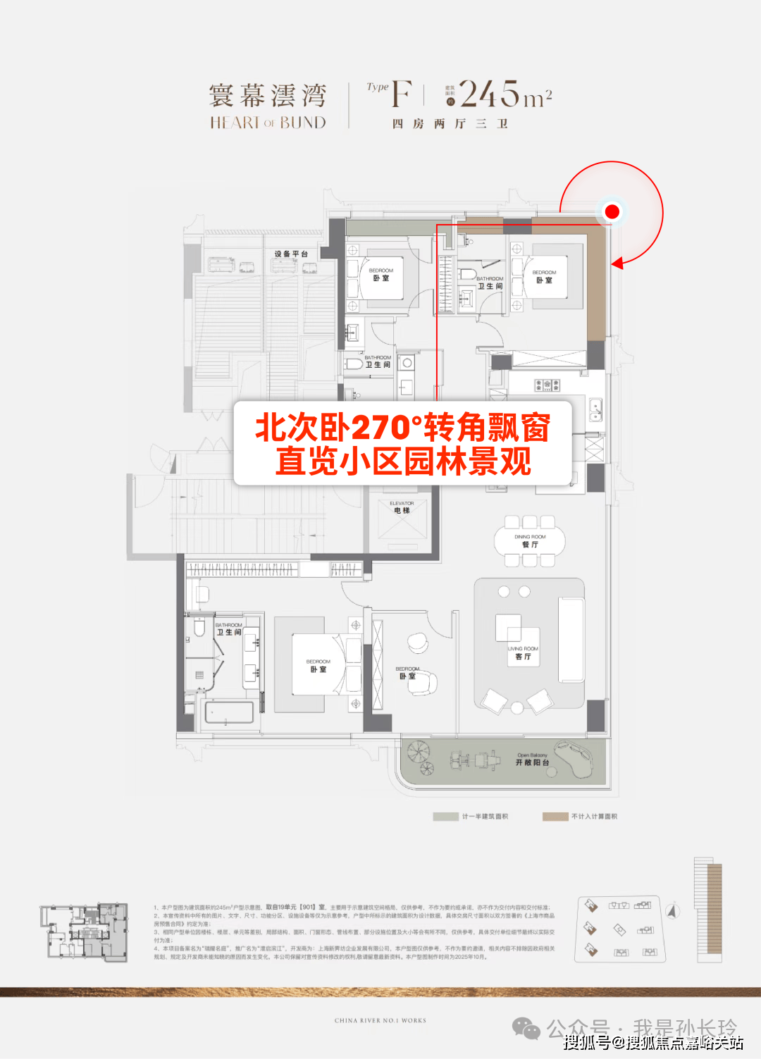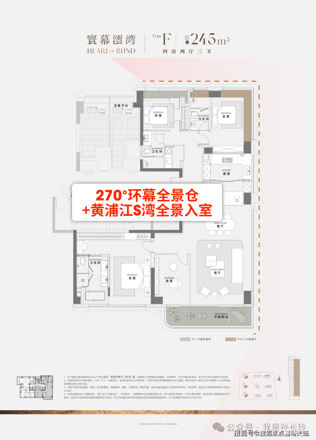南向约15米瞰江面,东向纵瞰河与园,北向拥揽世博与园景,堪称上海滨江环幕全景平层范本!